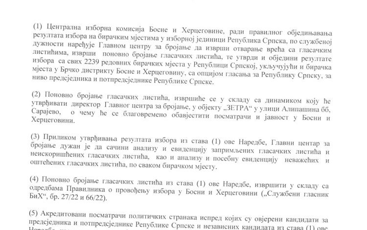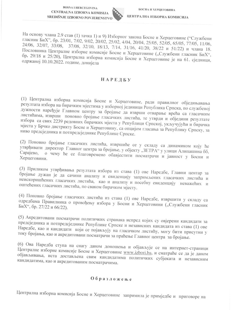 – Ponovno brojanje glasačkih listića izvršiće se u skladu sa dinamikom koju će utvrditi direktor Glavnog centra za brojanje o čemu će se blagovremeno obavijestiti izborni posmatrači i javnost. Navedena Naredba Centralne izborne komisije BiH uslijedila je nakon izvršenog uvida u zaprimljene primjedbe i prigovore na izborni proces, kao i nakon uvida u video i drugu dostavljenu dokumentaciju – navodi CIK.