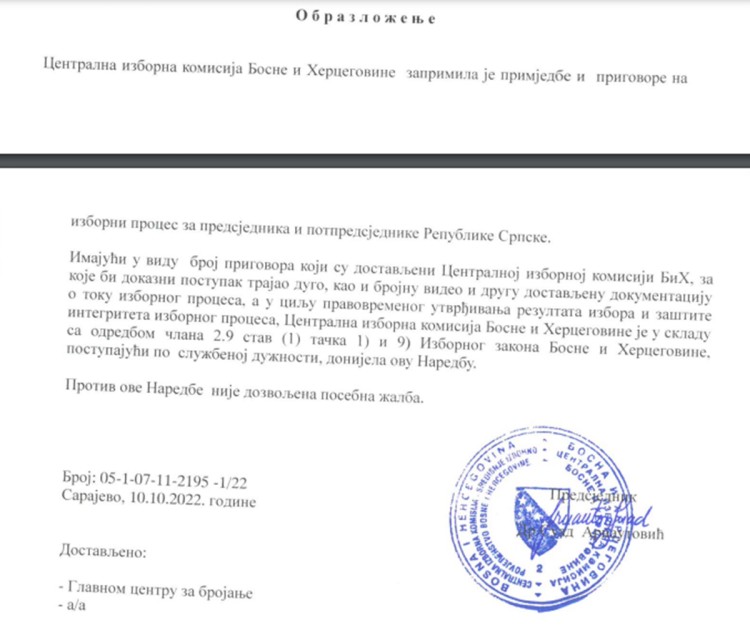 Centralna izborna komisija BiH objavila je na svom sajtu danas donesenu naredbu o novom brojanju glasova za predsjednika Republike Srpske, kao i njeno obrazloženje.