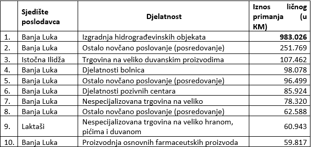 Listu zatvaraju radnik zaposlen u Laktašima u oblasti nespecijalizovana trgovina na veliko hranom, pićima i duvanom sa 60.943 KM i u Banjoj Luci u firmi koja se bavi proizvodnjom osnovnih farmaceutskih proizvoda koji je zaradio 59.817 KM.
