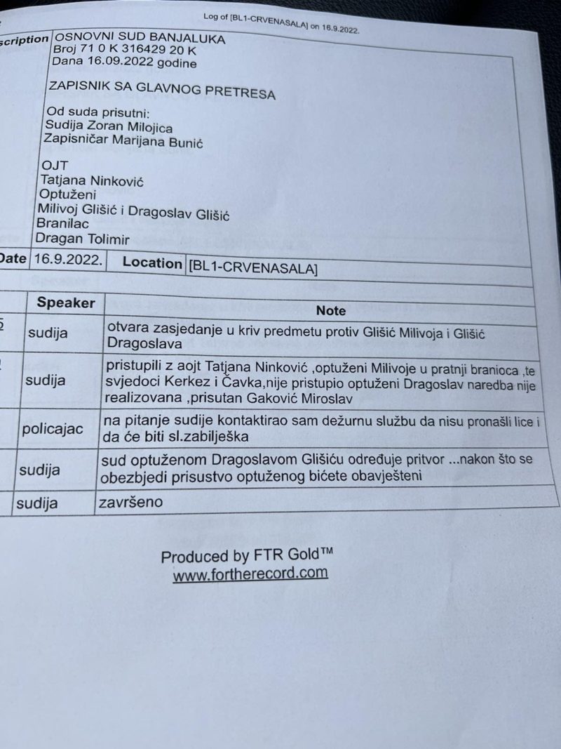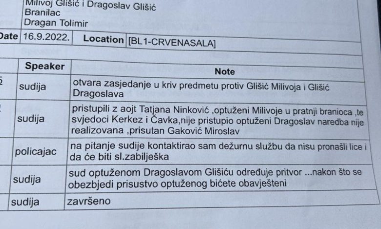 Sud optuženom Dragoslavu Glišiću određuje pritvor. Nakon što se obezbijedi prisustvo optuženog stranke će biti obaviještene – naveo je sudija Zoran Milojica.