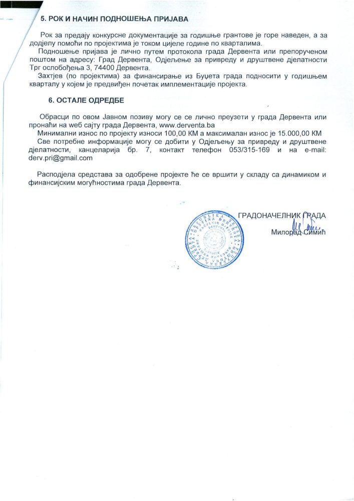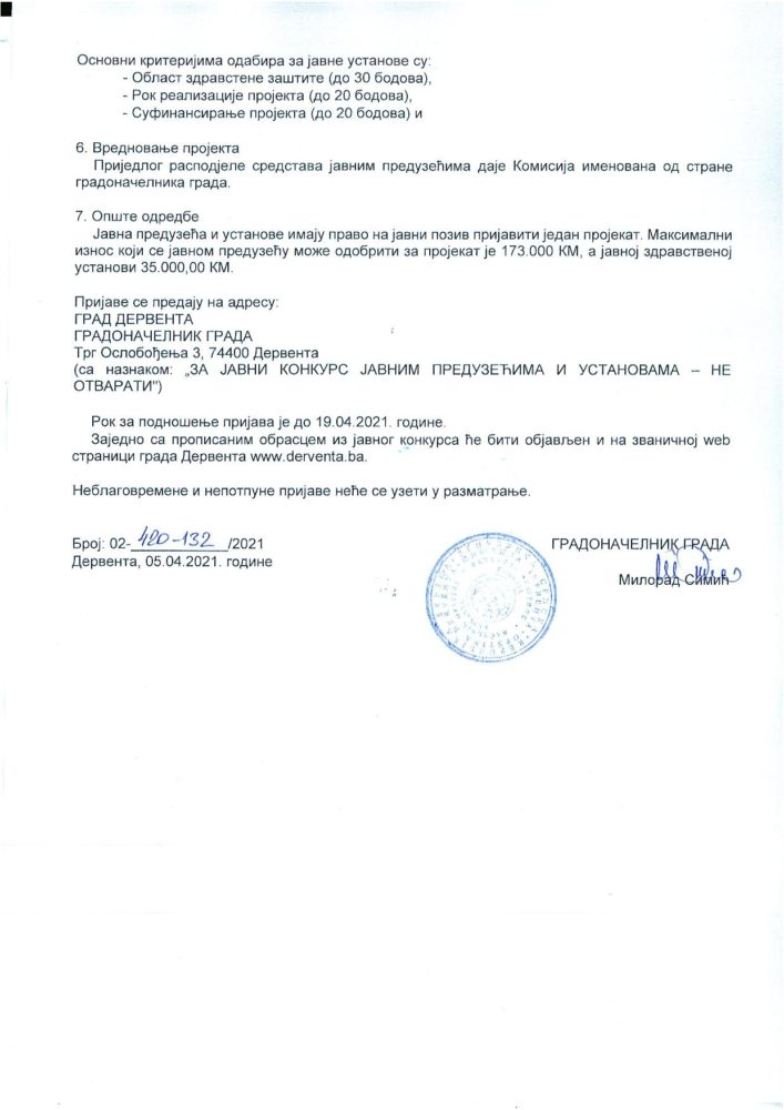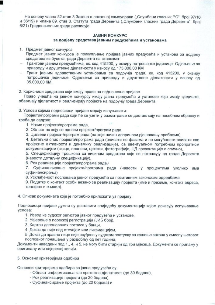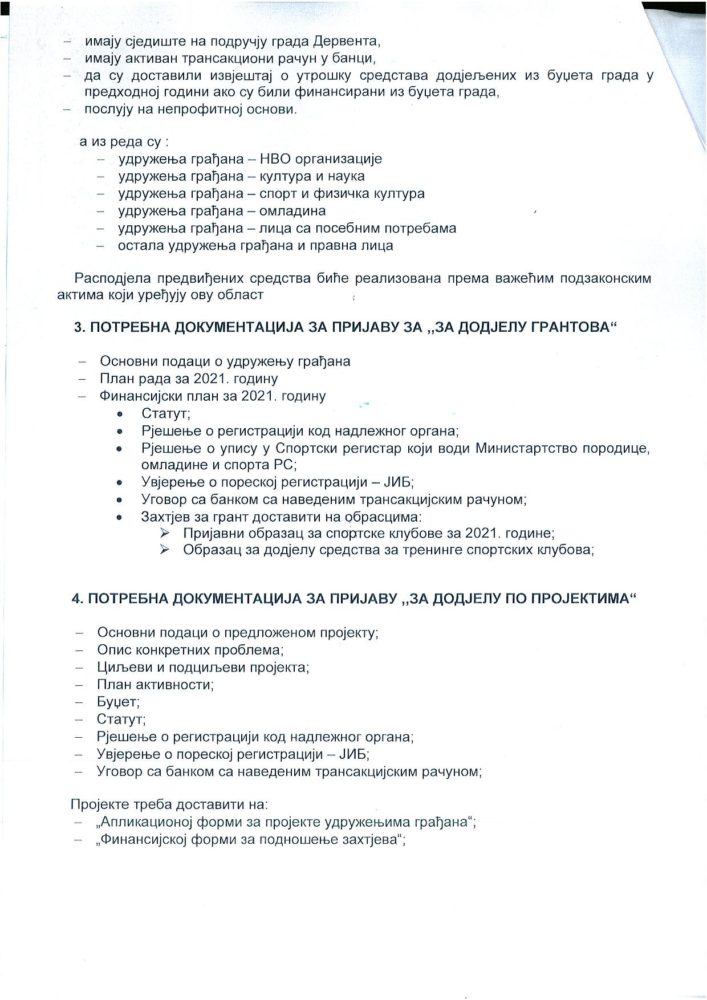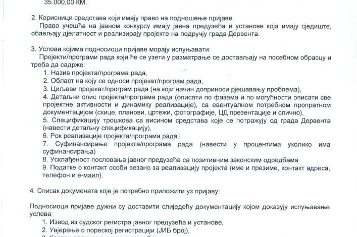 Gradska uprava Derventa raspisala je javne pozive za sufinansiranje programa i projekata udruženja građana, kao i programa javnih preduzeća i ustanova za 2021. godinu.