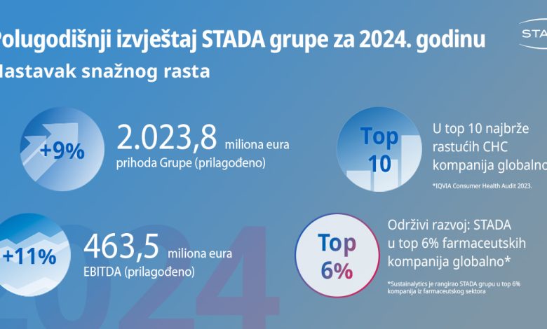 STADA Grupa ostvarila je prodaju od preko 2 milijarde eura u prvoj polovini ove godine. Prihodi Grupe u periodu od šest mjeseci, koji se završio 30. juna 2024, porasli su za 9% na 2,02 milijarde eura u poređenju sa prvom polovinom 2023, prevazilazeći tržišne trendove, dok su efektivna ulaganja rezultirala porastom prijavljene dobiti prije kamate, poreza, deprecijacije i amortizacije (EBITDA), korigovanom za valutne fluktuacije i specijalne stavke, za 11% na 463,5 miliona eura.