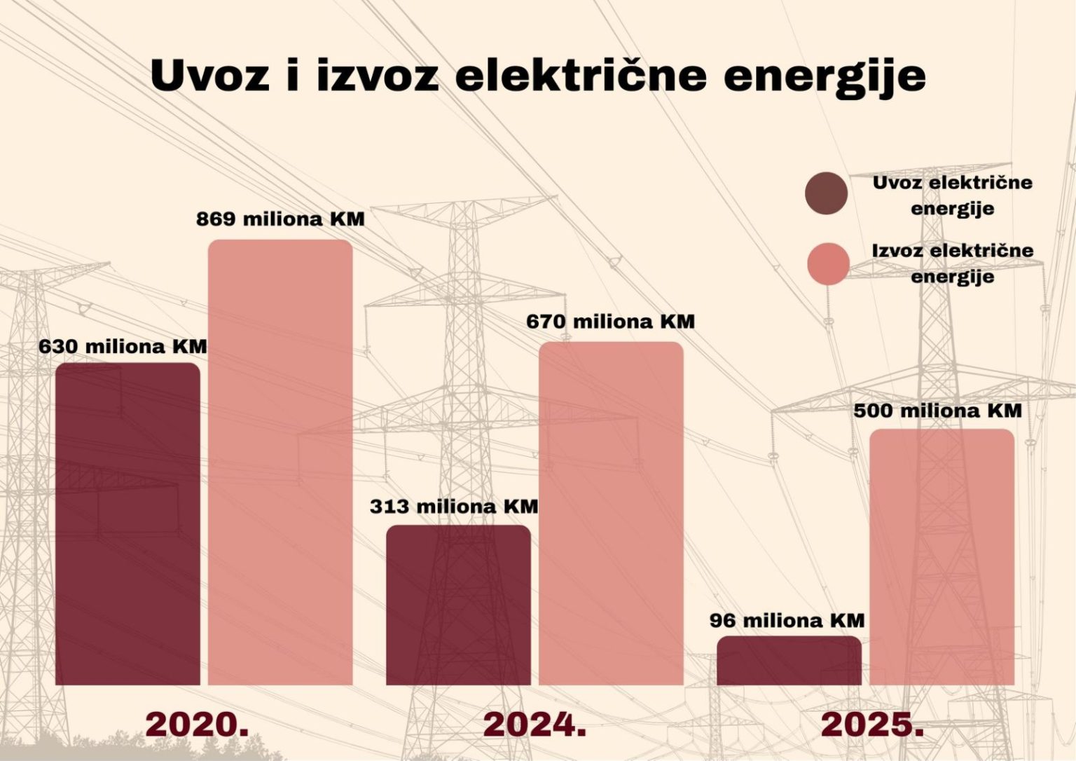 Kada govorimo o izvozu električne energije, u prošloj godini BiH je prodala 868.807.000 KM struje, što je oporavak u odnosu na 2024. godinu kada je izvezla 669.778.000 KM.