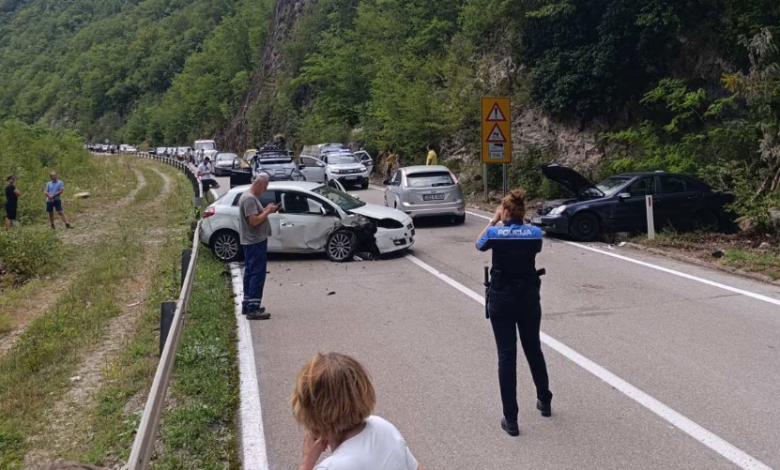 Zbog sudara automobila obustavljen je saobraćaj u mjestu Podmilaćje na magistralnom putu Jajce–Banjaluka, saopšteno je iz Bihamka.