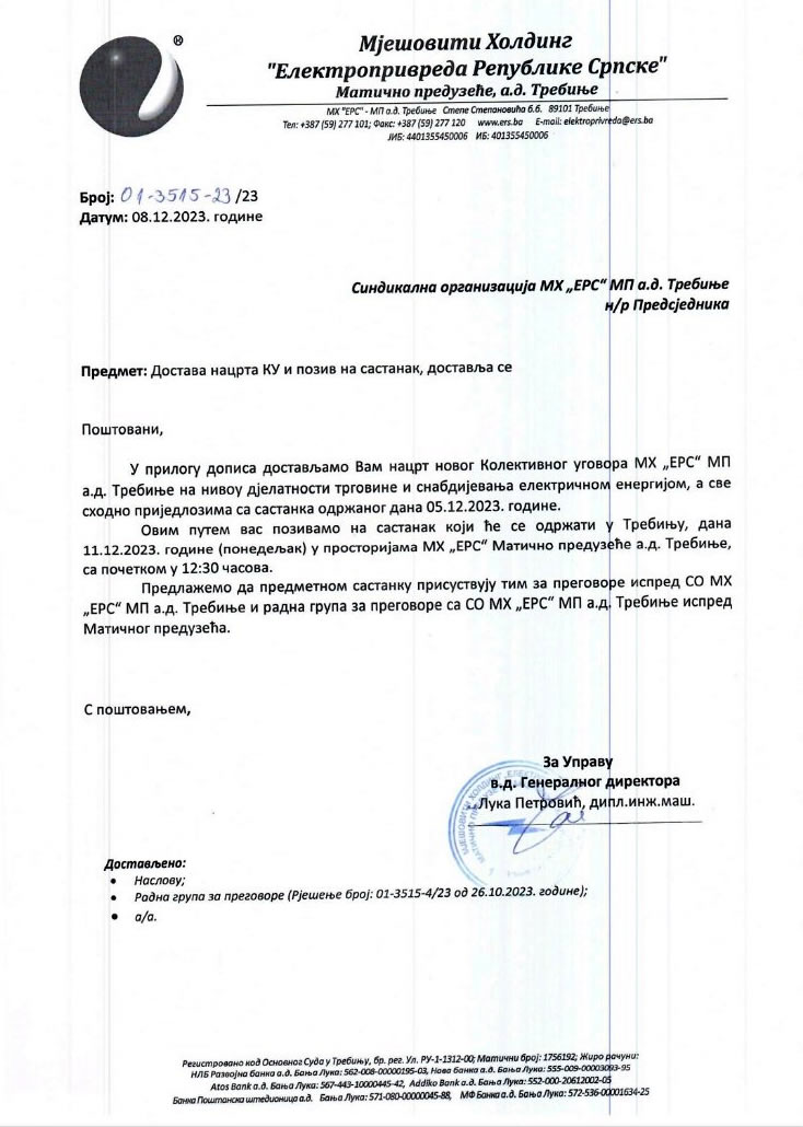 – Prava istina je, da je samo Sindikalna organizacija MH „ERS“ Trebinje dobila poziv da razgovara sa Upravom. Ovakav poziv smatramo pokušajem razbijanja jedinstva Sindikata i obmane sindikalnog članstva i javnosti – saopštili su iz Odbora sindikata ERS-a.