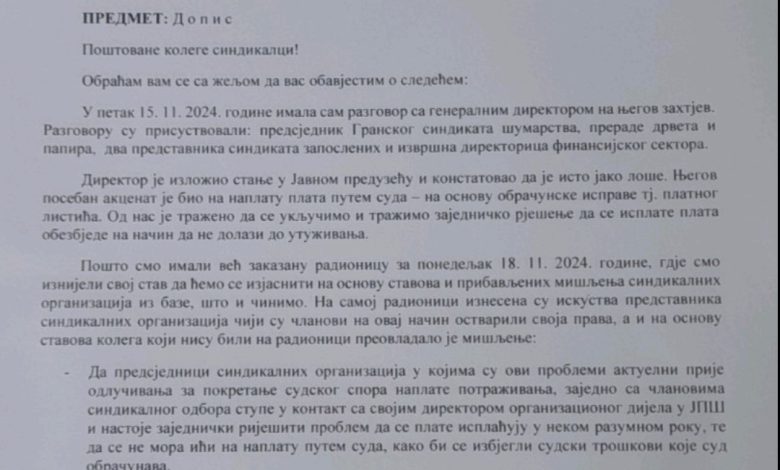 U dopisu koji je potpisala predsjednica JUSO Branka Zeković navodi se da je zajedno sa predsjednikom Granskog sindikata šumarstva razgovarala sa generalnim direktorom „Šuma RS“ Blaškom Kaurinom koji je, kako kaže, „na sastanku izložio stanje u preduzeću i konstatovao da je jako loše“.