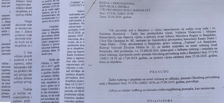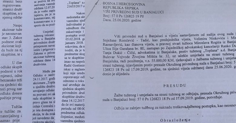 Prvostepena presuda Okružnog privrednog suda u Banjaluci donesena je 17. septembra prošle godine i u njoj je prvi put poništena odluka vanredne skupštine akcionara Toplana a.d. Banjaluka o prenosu akcija manjinskih akcionara na otkupioca, a tuženi je obavezan da tužiocu nadoknadi troškove parničnog postupka u iznosu od 6.200 KM sa zakonskom zateznom kamatom pod prijetnjom prinudnog izvršenja. Ova presuda je potvrđena i odlukom Višeg privrednog suda 25. juna ove godine, nakon čega je uslijedilo ulaganje revizije kojom se traži ukidanje ove presude u cijelosti.