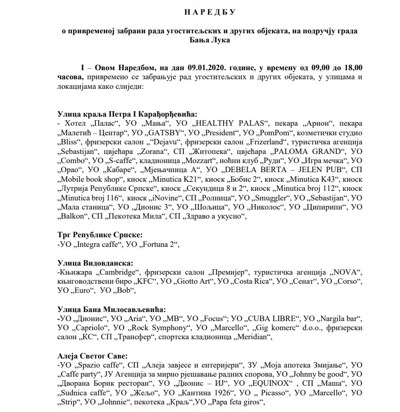 Zbog obilježavanja Dana Republike Srpske, u četvrtak 9. januara, u vremenu od 9.00 do 18.00 časova, privremeno će biti zabranjen rad ugostiteljskih i drugih objekata na području grada Banje Luke.