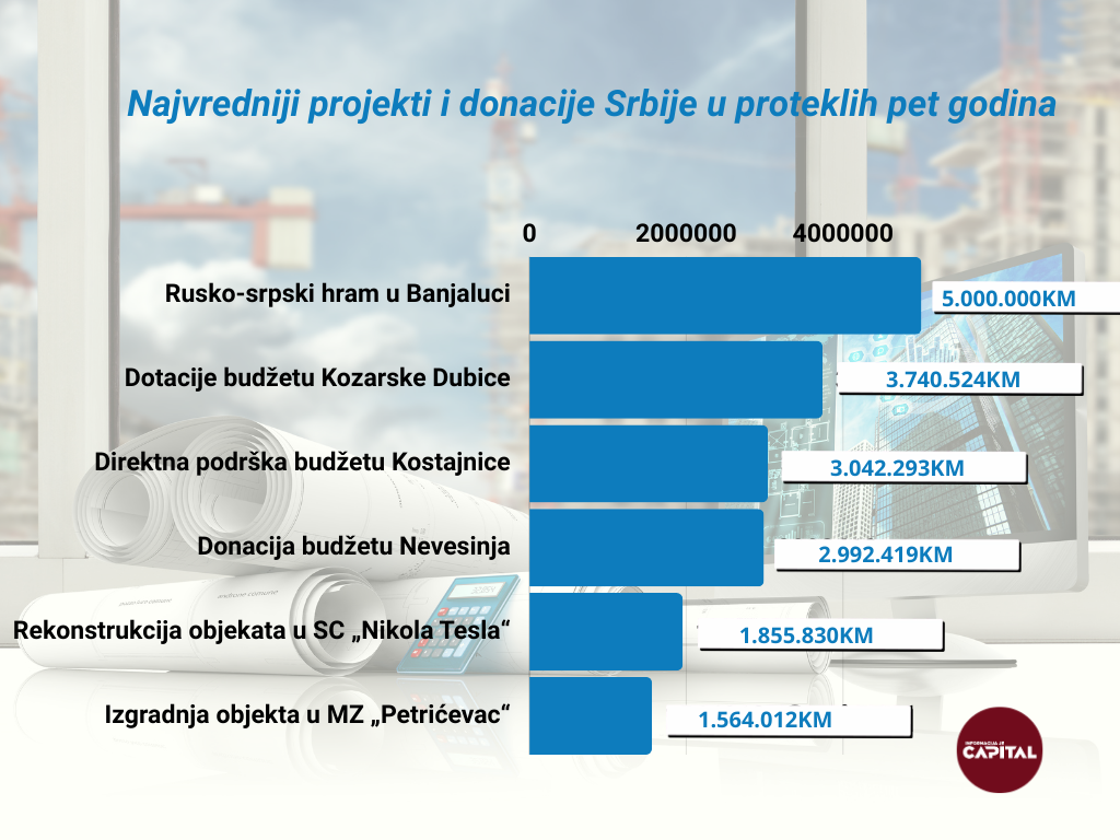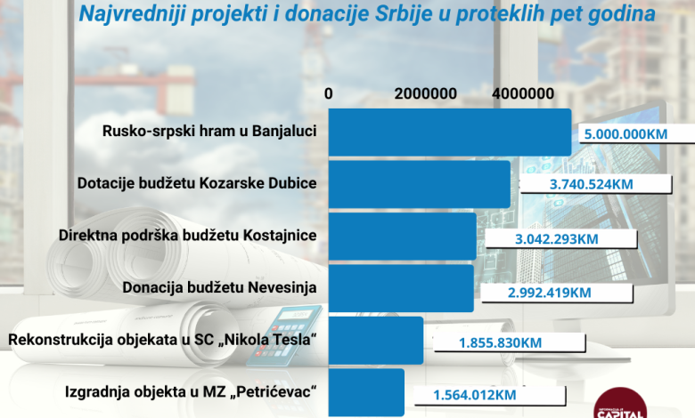 Kada su u pitanju donacije lokalnim budžetima Srbija je ranije donirala oko 3,7 miliona KM budžetu Kozarske Dubice, oko tri miliona Kostajnici, kao i 2,9 miliona KM Nevesinju.