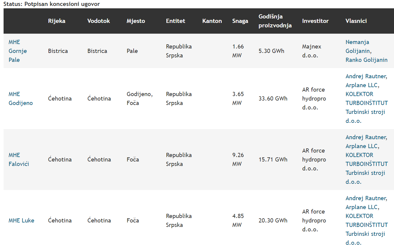 U pitanju su koncesije za „MHE Godijeno“, „MHE Falovići“ i „MHE Luke“. Zajedno, njihova snaga je 17,7 megavata, a godišnja proizvodnja oko 70 gigavat časova.