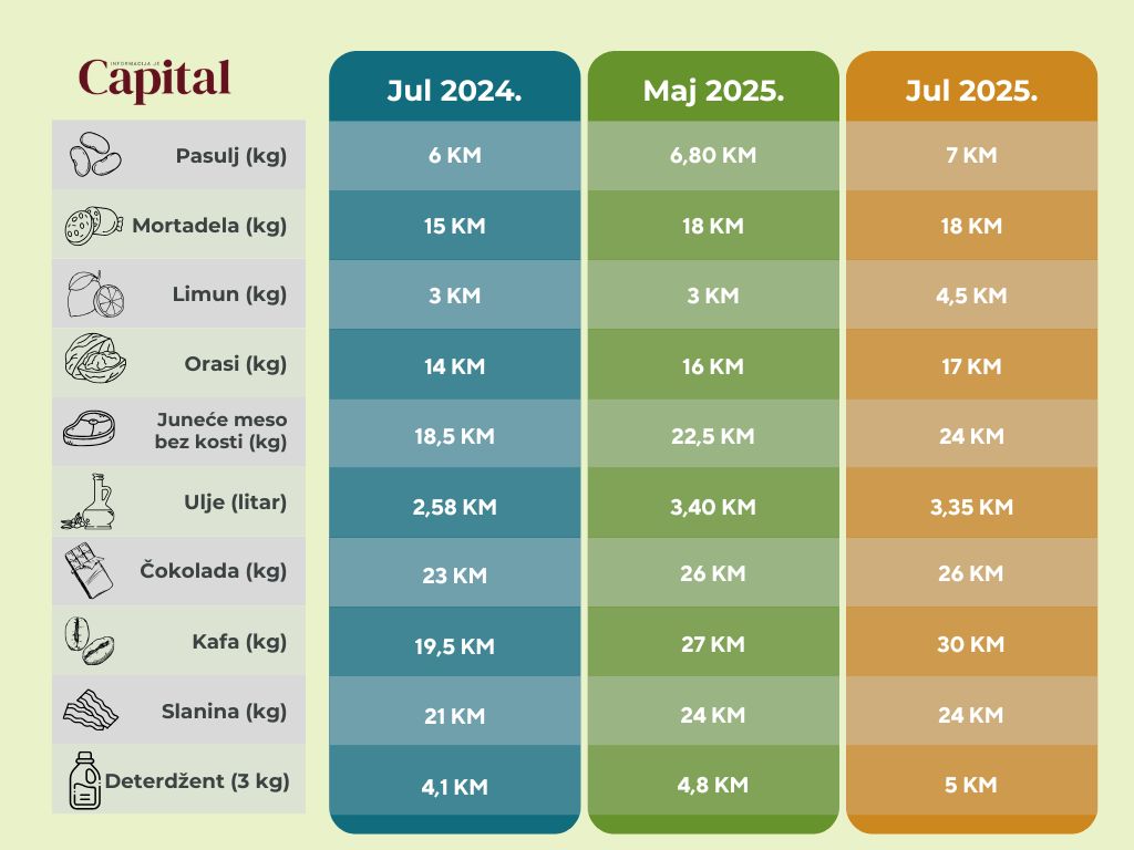 Orasi se pazare po cijeni 17 KM, a plaćali su se 14 KM, dok se za tri kilograma deterdženta mora izdvojiti u prosjeku oko pet maraka, što je za 0,90 KM više nego prije godinu dana.