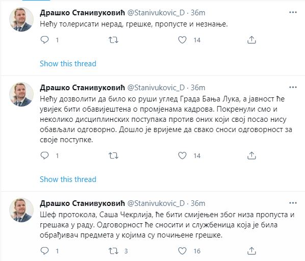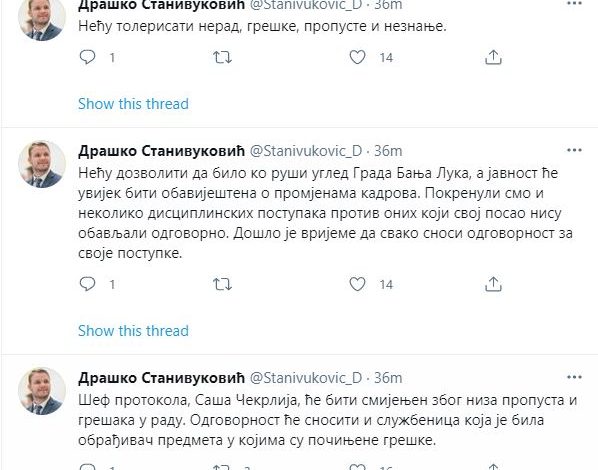 "Šef protokola Saša Čekrlija će biti smijenjen zbog niza propusta i grešaka u radu. Odgovornost će snositi i službenica koja je bila obrađivač predmeta u kojima su počinjene greške.", naveo je Stanivuković na twiteru.