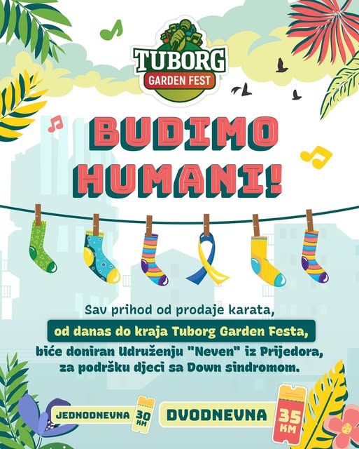 “Sav prihod od karata koje se kupe danas, sutra i u subotu doniraćemo Udruženju roditelja djece sa posebnim potrebama ‘Neven’, te pozivamo sve da dođu na ‘Tuborg Garden fest’, kupe karte, dobro se zabave, a ujedno budu humani. Podsjećamo, da smo još jednu humanitarnu akciju organizovali sredinom juna, gdje smo 10% prihoda od svih prodatih ulaznica u određenom periodu namijenili za pomoć Udruženju ‘Anemona’ iz Prijedora, za pomoć oboljelim od astme i hronične opstruktivne bolesti pluća”, istakli su organizatori.