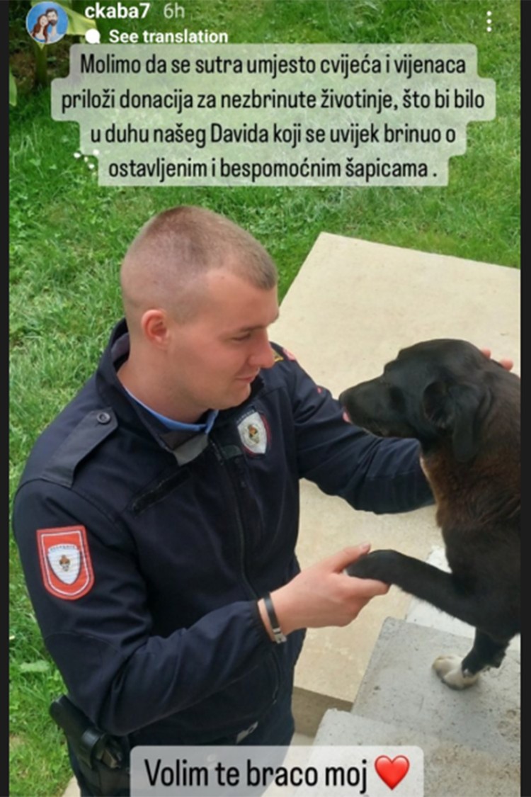 – Molimo da se sutra umjesto cvijeća i vijenca priloži donacija za nezbrinute životinje, što bi bilo u duhu našeg Davida koji se uvijek brinuo o ostavljenim i nezbrinutim šapicama – napisala je Nikolina uz fotografiju Davida u uniformi dok drži malu crnu šapicu.