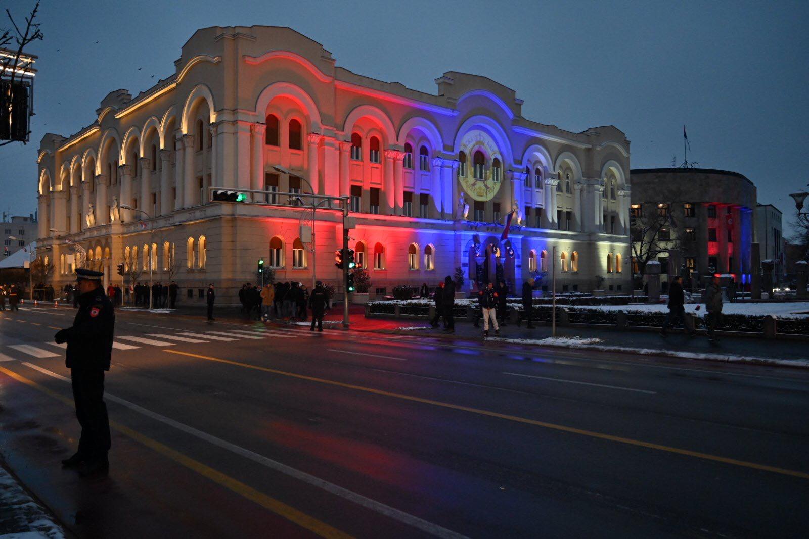 Banski dvor i Palata Predsjednika Republike svijetle u bojama srpske trobojke.