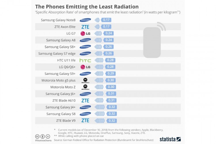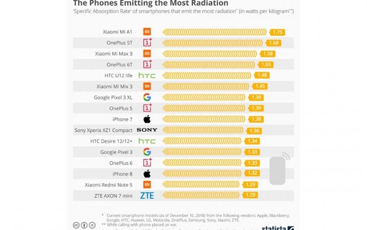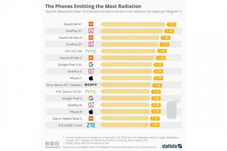 Prema ovom listingu, telefon koji emituje najviše nivoe radijacije je Xiaomi Mi A1, koji oslobađa 1,75 vati radijacije po kilogramu. Iza njega je OnePlus 5T sa 1,68 vati po kilogramu. Još neki popularni telefoni na ovoj listi su OnePlus 6T (četvrto mjesto sa 1,55 vati po kg), Pixel 3 XL (1,39 vati po kg), Pixel 3 (1,33 vati po kg) i Apple iPhone 8 (1,32 vati po kg).