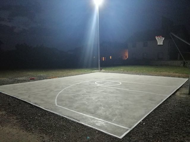 Sakupili novac, kupili 8 kubika betona, teren gotov. Sad je bilo lakše. Ali brzo padne mrak, i nema više igre. Daj da kupimo i reflektor. Teren osvjetljen, sad se basket može igrati do kasno u noć. Naravno i teren smo ocrtali, ne može se igrati bez “trice” i “slobodnog bacanja”. U međuvremenu Kafe bar Koš dao novu tablu i obruč, mnogo kvalitetniji, i ta to dugujemo veliku zahvalnost.