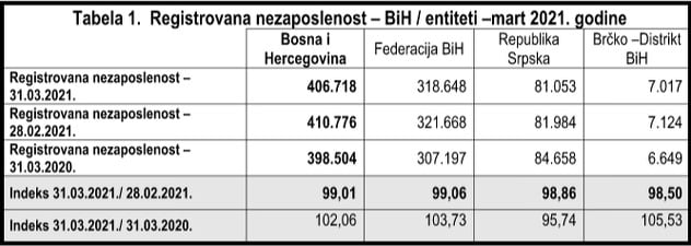 Zaključno sa 31. martom, u BiH je bilo 406.718 osoba na evidencijama zavoda i službi zapošljavanja u BiH, što je u odnosu na prethodni mjesec manje za 4.058 osoba ili 0,99 posto.