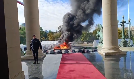 Kako se vidi na snimcima, gori veliki šator koji se nalazi između zgrade Skupštine i Pionirskom parku.