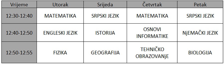 - Osmi razred, nastava traje od 12:55 do 13:25