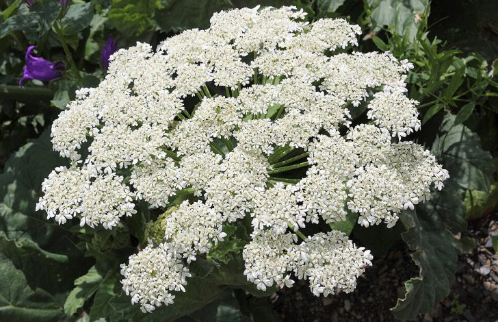 Ima velike listove, široke do metar i po, i velike bijele cvjetove u obliku kišobrana /štitova/ prečnika do 80 centimetra. Može da poraste i više od četiri metra u visinu.