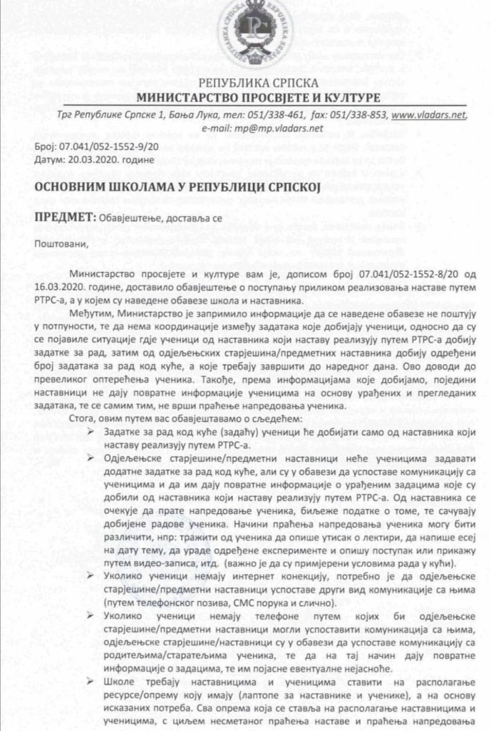 Ministarstvo je dobilo informaciju gdje učenici od nastavnika koji nastavu realizuju putem RTRS-a, dobiju zadatke za rad, zatim od odjeljenskih starješina/ predmetnih nastavnika dobiju određeni broj zadataka za rad kod kuće, a koje trebaju završiti do narednog dana. Ovo dovodi do prevelikog opterećenja učenika.