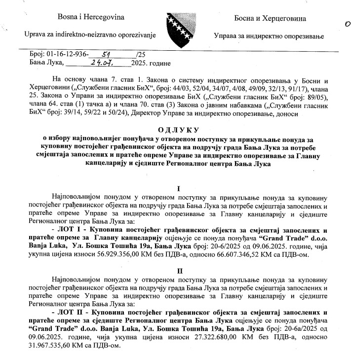 Nabavka je bila podijeljena na dva lota i to na lot za kupovinu postojećeg objekta za smještaj zaposlenih i prateće opreme za glavnu kancelariju, dok je drugim lotom tražen prostor za Regionalni centar Banjaluka.