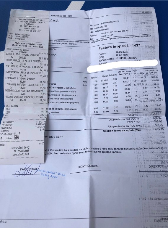 „Kada sam došao na banjalučko Gradsko groblje, rekli su mi da je pokojnica bila pozitivna na virus i da se tijelo mora preuzeti na drugom odredištu. Mi smo tako i uradili. Poslušali smo ih, iako nismo imali priliku ni da vidimo tijelo, niti znamo da je taj pokojnik unutra, niti kako je sve opremljeno“, prepričava Kljunić za eTrafiku.