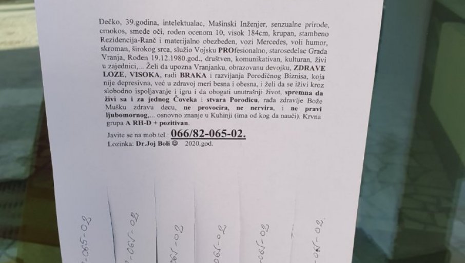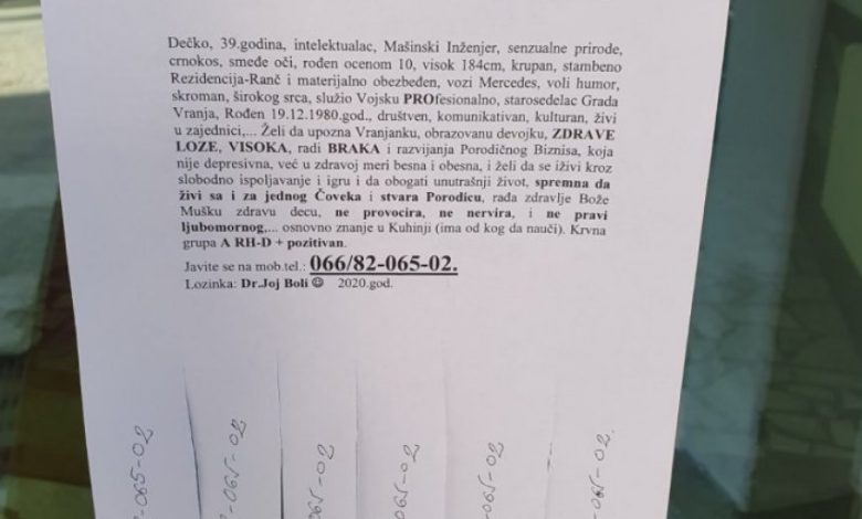 Gotovo sva odjeljenja vranjskog Zdravstvenog centra osvanula su oblijepljena listićima na kojima je odštampan oglas u najmanju ruku neobičnog sadržaja, koji je nasmijao i oraspoložio sve koji su ga vidjeli, a po svemu sudeći neke i zainteresovao, pa su se poslužili papirićima na kojima je odštampan broj telefona, čovjeka koji traži ženu pod šifrom „JOJ BOLI“, pišu Novosti.