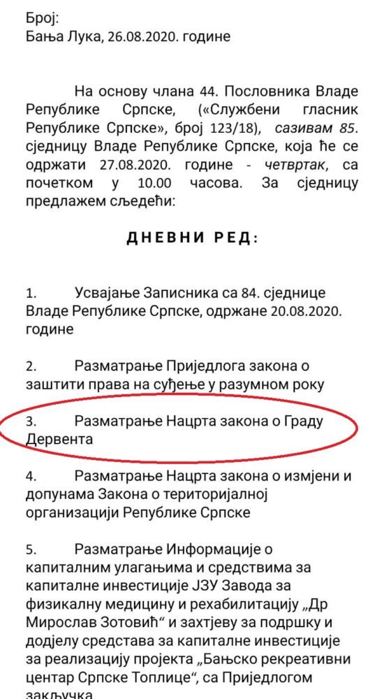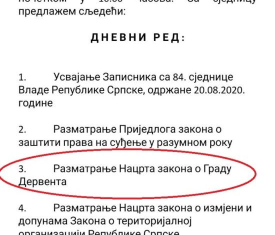 Na dnevnom redu današnje 85. sjednice Vlade Republike Srpske nalazi se i Nacrt zakona o gradu Derventa, te sa njim povezan Nacrt zakona o izmjeni i dopunama Zakona o teritorijalnoj organizaciji Republike Srpske.