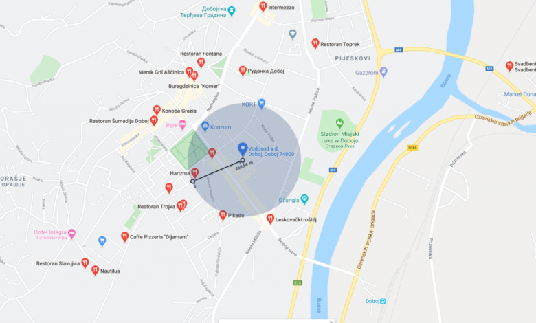 Uvidom u mapu grada Doboja, vidljivo je da se u radijusu od 300 metara od adrese Vodovda a.d. nalazi samo jedan restoran koji ispunjava ove uslove – Harizma.